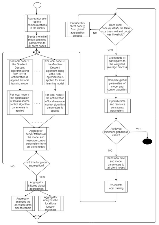 Moreover, a major operation of MulticloudFL is the fact that given a specific amount of resources’ constraints, i.e., the maximum available time in which the FL system should have completed the learning process, it should find the optimal values of and T = K* (as already defined) so that the global loss function of the FL system is minimized at the end (Equation (2)). For that purpose, a Control Algorithm is applied. The step time for each local update and the parameters of this Control Algorithm are optimized, first locally at each client node and finally after each global aggregation procedure. In general, as part of the whole FL process, the crucial point is the examination of whether the minimum value of the global loss function has been achieved. If not, then the new calculated model parameters and new step time are sent back to the client nodes, the local training on the nodes is re-initiated and the whole described learning process is repeated. It is true that the process of the multi-cloud synchronous federated learning may initially cause some delays as the number of participating nodes increases. Of course, the whole FL system is fully scalable in terms of nodes, and, in conjunction with the control algorithm, the time execution is optimized. Theoretically, no restrictions on the number of participating nodes should be met. In Figure 1, we provide a flow diagram that depicts the main steps of our MulticloudFL.