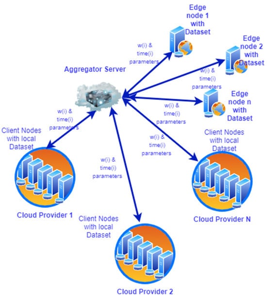 where N defines the number of client nodes, denotes the size of the local client node dataset, and D the total size of the dataset of the entire edge and multi-cloud computing system, provided in the following listing: