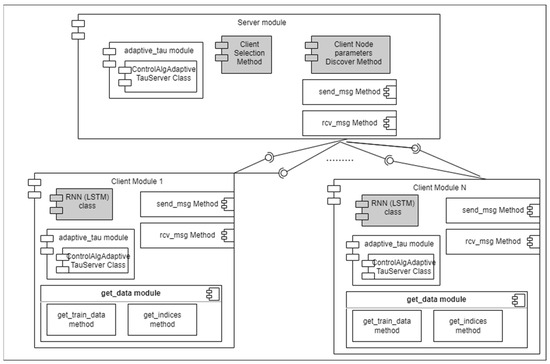 It is important to mention that the various modules, classes, and methods are implemented by using python language version 3. The open-source libraries developed by Google of Tensorflow [34] are used in our FL system, focusing on the Keras technology [35]. A general overview of the Architecture with the newly developed modules emphasized with gray color is shown in the following Figure 3.