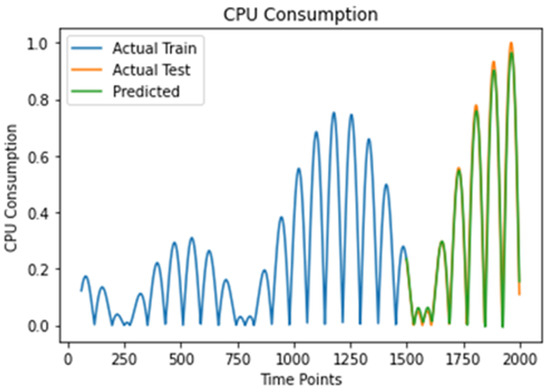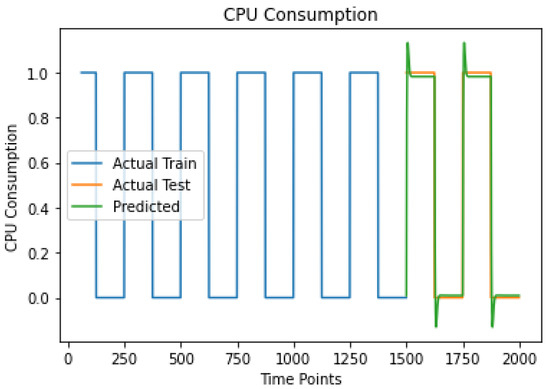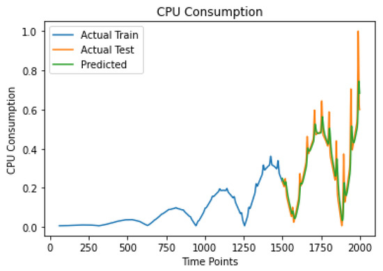 In the experiments shown in this section, CPU consumption metrics are used from various client nodes to give an accurate prediction of future CPU consumption (workload). Therefore, after the training of the Total FL algorithm, there is a comparison between the Inference results (Predicted green lines in the figures) and the Real expected results (Actual Test orange lines). We adopt the Mean Absolute Error (MAE) [38], Mean Squared Error or Loss [39] (MSE), Root Mean Squared Error (RMSE) [40], Mean Absolute Percentage Error (MAPE) [41], and Symmetric Mean Absolute Percentage Error (SMAPE) [42] to give an overview of the accuracy achieved for each data type case (n = number of nodes, is the pragmatic value (orange lines in the following figures), is the predicted value (green lines)):