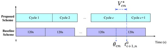 The second term refers to the sum of the variance of cycle ending times between the actual end time and the baseline, as shown in Figure 2. In the case of fewer BSP requests (assuming the first term is already satisfied), minimising the second term can induce the signal timing to restore to the baseline state, which is beneficial to keeping the offset between the upstream and downstream intersections. Hence, is a relatively small number (0.5 in this study), to make sure that the restoration is conducted when the density of the BSP requests is at a lower level.