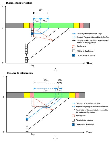 According to Figure 4b, the served bus will arrive at the intersection after the standing queue at the stop position (which needs green time to clear) and the moving vehicles preceding the bus with a bus priority request in the platoon (which needs green time to clear). Hence, the bus delay will be larger than when the priority request is served. can be calculated by a real-time queue length estimation [], while can be calculated by the upstream stop-bar detector and the time the priority vehicle passes the upstream intersection [].