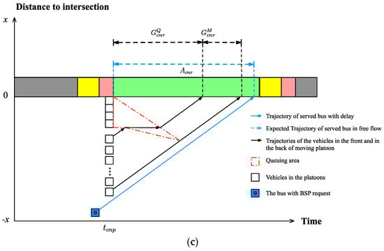 According to Figure 4c, the served bus will not be delayed by the platoon, which means that . As is a non-negative variable constrained by Equation (16), the constraint will be released.