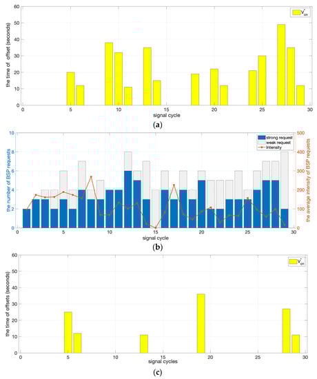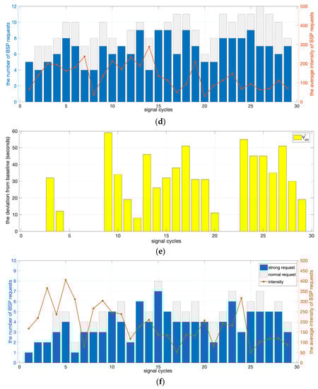 Over the 30 cycles of the simulation, the bias of S3 from the default signal scheme and the distribution and intensity of the BSP requests are discussed, as shown in Figure 6. In Figure 6a,c,e, the yellow bar is the bias of the cycle ending time (), which is calculated by the absolute difference between the actual ending time and the baseline ending time of any given signal cycle c. In Figure 6b,d,f, the red line (the priority of requests) refers to the sum of the absolute differences between the predicted intersection delay and the ideal delay of each BSP request in a cycle. This term is calculated as . The blue bars (strong requests) are the frequency of the BSP requests behind schedule in a cycle (). The grey bars (weak requests) are the frequency of the BSP requests ahead of schedule in a cycle ().