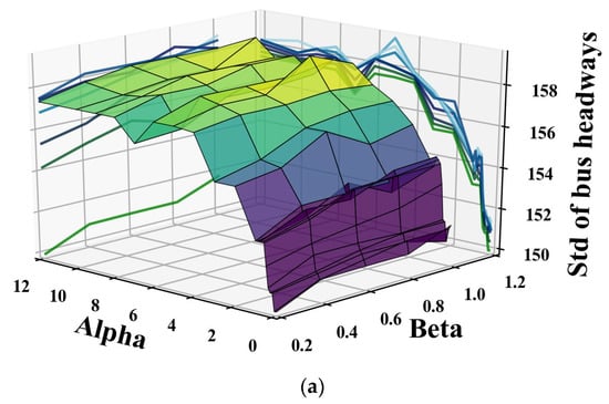 In the concluding section, the trade-off among terms in the objective functions: variance of bus headways, the bias of cycle ending times and the duration of green times are discussed. We conduct a sensitivity analysis of the amplified parameters and (in objective function) as shown in Figure 7.