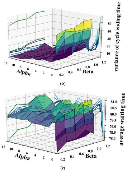 When compared with α, the effect of β is relatively small and random. Specifically, when β increases, AWT and STH both increase slightly. In other words, the balance of the green signal distribution of the distinct phases does not impose a significant burden on the optimal solution while the β is relatively small (0–1).