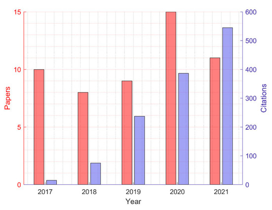 The remaining portions of this paper’s findings are primarily based on 53 SSG-related papers [21,22,23,24,25,26,27,28,29,30,31,32,33,34,35,36,37,38,39,40,41,42,43,44,45,46,47,48,49,50,51,52,53,54,55,56,57,58,59,60,61,62,63,64,65,66,67,68,69,70,71,72,73] that were published between 2017 and 2021. We did not consider surveys that just referenced gamification techniques or games in passing or whose material was not accessible online. The number of the chosen surveys and their annual citation numbers are shown in Table 2. The number of citations of a study is the number of times other authors mention a study in their work. In Table 2, we give a total number of citations for all analyzed review studies in each year. The number is provided according to the Scopus bibliographic database. Most review papers were published in 2020, while the number of citations demonstrated a consistent growth from 2017 with the highest number reached in 2021 (Figure 2). As a result, research in the field of SGG has significantly risen during the previous five years. This growing trend illustrates SGG’s current public and policy effect.