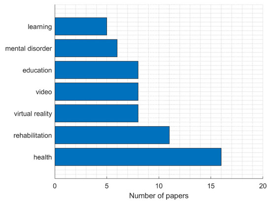 After the analysis of the abstract and text of the selected reviews, we identified seven common study topics of interest, as follows: general health (16), rehabilitation (11), virtual reality (8), video games (8), education (8), mental and cognitive disorder (6), and learning (5). Here, mental and cognitive disorders include intellectual impairments and conditions such as anxiety, depression, Parkinson’s disease, Alzheimer’s autism spectrum disorder (ASD), etc. Education is related to all aspects of teaching, and the use of games in the pedagogical context to improve the engagement of students and the delivery of professional knowledge in a formal environment. Rehabilitation is focused on actions meant to enhance functioning and minimize impairment in people with health issues (such as after traumas or chronic disease) as they interact with their environment. General health focuses on maintaining health and well-being throughout the lifetime by practicing exercise, diet, preventative health checks, oral hygiene, etc. Virtual reality (VR) is a computer-generated environment featuring realistic-looking images and objects which immerse the viewer in their surroundings using specialized equipment (VR headset) with visual feedback. Video games are any electronic games that are based on interaction and visual feedback. Note that the topics are naturally overlapping. Moreover, several review articles which do not fall into any of the categories highlight the interdisciplinary nature of the SGG domain.