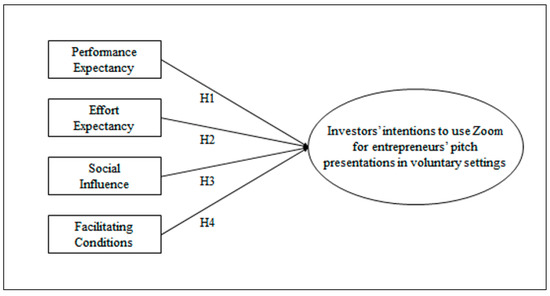 In summary, the aim of the present study is to investigate the extent to which constructs of the UTAUT model—performance expectancy, effort expectancy, social influence, and facilitating conditions—are associated with investors’ behavioral intentions of using Zoom for entrepreneurs’ pitch presentations in voluntary settings after the pandemic. The theoretical model is summarized in Figure 1.