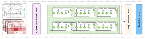 The structure of the DSGCN model proposed in this study is shown in Figure 1. DSGCN mainly consists of GCN and two layers of DSTM, which can handle complex time-dependent and spatial dependencies. First, the input data are processed by GCN to capture the spatial features of traffic data. Second, the two-layer DSTM can capture the temporal features of traffic data and can have better adaptability with time changes. At each time slice, the DSTM can analyze the temporal correlation of traffic congestion more accurately. Finally, the fully connected layer is used to calculate the predicted values.
