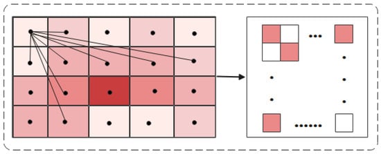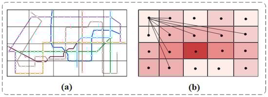 It is not suitable for global traffic congestion prediction when data are collected only from highways, streets, etc. Therefore, in this article, the traffic network is divided into grids, and each grid represents an independent area. As shown in Figure 2a. In this article, the center points of the grid are abstracted as nodes. As shown in Figure 2b.