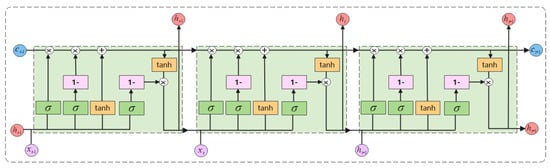 As shown in Equations (11)–(14), the information obtained from the long-term feature capture phase, the information obtained from the long-term and short-term feature fusion phase, and the information obtained from the short-term feature capture phase are all converted to values between 0 and 1 by a sigmoid activation function after multiplying the splicing vector by the weight matrix as a kind of feature capture phase. In addition, is the result will be converted to a value between −1 and 1 by a tanh activation function. The formula for calculating the long and short memories of DSTM is shown in Equations (15) and (16).