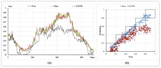 Comparison of DSGCN and LSTM prediction results. (a) is a time-series variation plot. (b) is a numerical scatter plot.