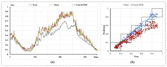 Comparative effect of DSGCN and ConvLSTM predictions. (a) is a time-series variation plot. (b) is a numerical scatter plot.