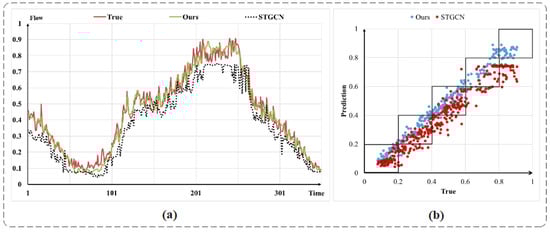 Comparison of DSGCN and STGCN prediction results. (a) is a time-series variation plot. (b) is a numerical scatter plot.