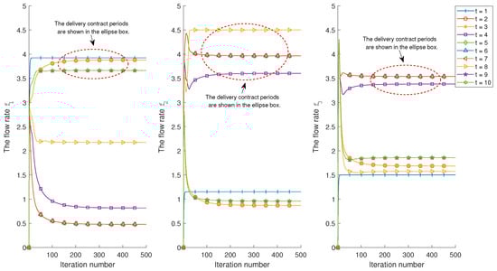 The impact of data timeliness on flow rates are shown in Figure 5, where the time slots in the ellipse box is within the delivery contract periods. We can observe that the proposed algorithm not only responds to traffic variations in real-time, but also provides fast convergence to the optimal solution. Moreover, it can be observed that the flow rates usually increase within their contract periods, as we would expect, and are usually lower outside contract periods. This is because the system sets aside resources for other source data flows with contracts. Therefore, when many heterogeneous flows are transmitted concurrently, the inelastic flows with tasks are assigned resources in priority. This not only achieves real-time delivery of flow data, but also improves resource utilization.