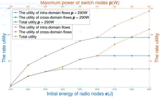 Furthermore, Figure 6 illustrates the impact of the energy limitation of equipment on the rate utility. It can be seen that the value of total utility solved by the proposed algorithm firstly increases along with the initial energy of radio nodes until J, . The higher initial energy allows radio nodes to provide higher transmission rates to complete data delivery. Hence, IIoT users can obtain more efficient services, which increases the value of total utility. As the initial energy of the radio nodes exceed 2600(J), the value of total utility remains unchanged. The reason why the value of total utility no longer increases is the presence of other constrained resources. For example, the maximum power constraint of switches also impacts flow rates. Besides, as shown in Figure 6, when the initial energy of radio nodes is high, increasing the maximum power of switches will significantly increase the utility value of cross-domain flows, but will not change the utility value of intra-domain flows. This is because a large number of cross-domain flows pass through switches per unit time, while intra-domain flows do not. Therefore, it is necessary to carefully consider the maximum energy consumption per unit time for each radio device and switch. By doing so, we both improve the utilization of constrained resources, and reduce the equipment cost of IIoT networks.