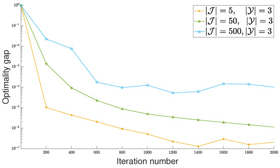 In order to verify whether the number of source data flows has a strong impact on the convergence rate of proposed algorithm, we set up networks in three scales: , with , and with . The corresponding simulation results are shown in Figure 7. Here, Optimality gap means the relative error between the optimal utility and the utility achieved by the proposed algorithm. In fact, the proposed algorithm can improve the optimization gap by continuously providing effective measures that satisfy user requirements. The results show that the increased numbers of data flows do not affect the convergence behavior of proposed algorithm.