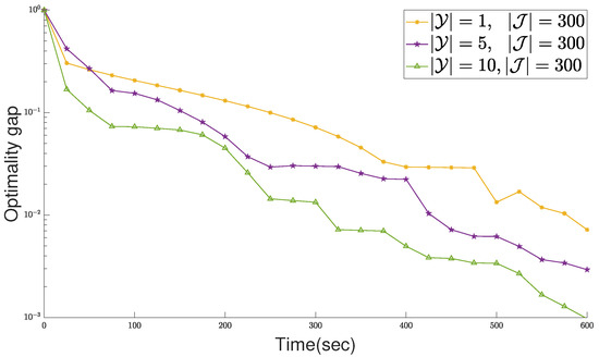 In order to verify whether the number of network domains has a strong impact on the convergence rate of proposed algorithm, we set up networks in three scales: with , with , and with . Figure 8 indicates the optimality gap over time within a deadline of 10 min for networks with different number of domains. It can be observed that distributed parallel computing permits the proposed algorithm to converge faster. For example, to reach a gap below 1%, the network with 1 domain takes about 10 min, whereas the network with 10 domains takes only 5 min.