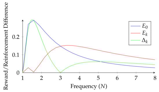 A significant difference between objective reinforcement and subjective reinforcement, for instance, , may characterize the learning process since it represents the process of determining the truth; in some way, it is like solving a given problem (i.e., game-theoretical value in a game solving context). As such, the comfort of learning will be optimized when is maximized at its peak when . Such a situation indicates that the theoretical success rate would be a peak point to feel comfortable in the non-competitive game or learning context. On the other hand, people would feel uncomfortable (e.g., dull/anxiety in the sense of flow theory []) when the rate is much lower than this point.