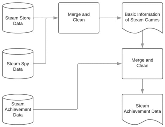 There are 57,155 pieces of Steam games store information and 23,774 Steam global achievement data were extracted, but, since the data still contain incomplete or missing information, data cleaning is necessary. A Python script was utilized in the data processing and merging, depicted in Figure 3. The figure showed the overview of the steps involved in pre-processing the data before in-depth analysis, which is explained as follows: