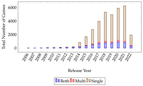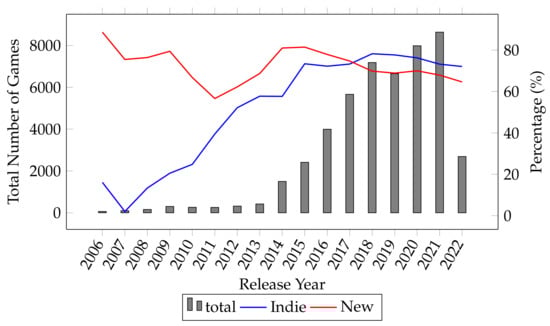 The first aspect explored the trend of game releases on Steam. Figure 4 shows the number of game releases, indie games ratio, and new game developers on the Steam platform from 2006 to 2022. The number of games released on Steam steadily increased every year except in 2010 and 2019 and had the highest increase in 2014 (1498 games released, 1079 or 350% more games than in 2013) after Steam introduced the Steam Early Access program in March 2013 []. The decrease that happened in 2019 possibly happened because of a games’ discoverability issue [,], where there were changes in Steam policies [] and also the arrival of Epic Games Store []. Though Steam has released Steam Labs (https://store.steampowered.com/labs) (accessed on 1 October 2022) that tackled the discoverability issues, no results were reported in achieving such an outcome []. The number might be unreliable because changes in early access games on Steam can affect the actual release numbers on the year []. In 2017, Steam launched Steam Direct [] to replace Steam Greenlight as a new submission path designed to provide a more streamlined, transparent, and accessible way for game developers to publish their games to Steam, which resulted in 340% more indie games released in 2018 than the previous year. Steam Direct allows game developers to publish their games without persuading fans or Steam users to vote on their game, provided they can afford the USD 100 recoupable fee and meet Steam’s essential criteria of legality and appropriateness.