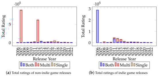 Figure 7, Figure 8 and Figure 9 have shown the average player rating, Steam rating, and game price for non-indie and indie game releases from 2006 to 2022. Due to the confidentiality of the data, the exact number of owners or sales for each game could not be analyzed, so we used the rating_total value instead. The rating_total shows the total number of ratings (both positive and negative ratings) a game received from its players, which we used as a metric to measure player populations. In terms of the total rating average, non-indie games received more ratings than indie games from their users, with PlayerUnknown’s Battleground (rated by 2,056,746 users and 53% of positive ratings) and Terraria (rated by 991,103 users and 98% positive rating), meaning that, though the Steam library is mostly populated by indie games, the players still gravitate toward purchasing more non-indie games than indie games. On average, the prices of non-indie games are higher than those of indie games, as shown in Figure 9a,b. Interestingly, the most expensive non-indie and indie games are VR Games such as Ascent Free-Roaming VR Experience, priced at USD 999 and Aartform Curvy 3D 3.0 priced at USD 299. The production cost, the shallow player base for VR Games, and the high-spec equipment needed to develop and play a VR game might be why VR games are more expensive than non-VR games.