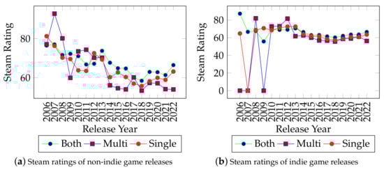 Steam ratings of game types released over the year for (a) non-indie games and (b) indie games.