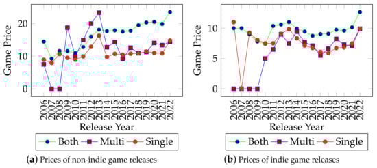 Prices of game types released over the year for (a) non-indie games and (b) indie games.