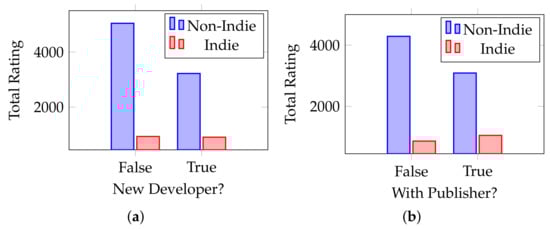 In a competitive environment such as the Steam market, working with a game publisher could improve the reach and enable your games to be noticed by Steam users. Figure 10b shows the average total rating of both non-indie and indie games from game developers who are working and are not working together with a publisher. Figure 10b shows that there is no significant difference in terms of the average total ratings received by self-published games and publisher-published games and, statistically, has a weak correlation (Spearman’s correlation coefficient, ). Although working with a publisher might not boost the total ratings they receive from the players, it can provide many benefits for indie game developers, such as instant validation and hype, effective app store and media distribution, professional advice from the experts onboard, efficient planning. and no upfront financial costs (except royalties) []. While it can be beneficial for indie game developers to work with publishers, especially for its financial and expert input, for non-indie game developers, publishing their games on their own will benefit them more since it provides them with more flexibility and freedom on how they sell their games.