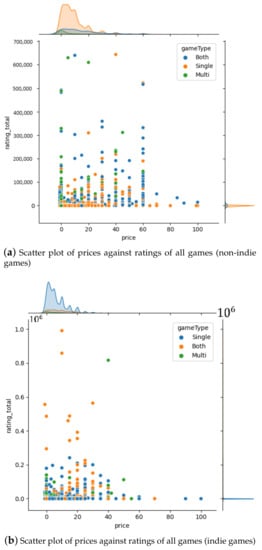There are multiple factors when it comes to pricing a game, such as development costs, the size of the game’s contents, and other factors. For example, Final Fantasy XV (https://finalfantasyxv.square-enix-games.com/) (accessed on 1 October 2022) was priced at USD 60 with the content worth 60 h of playtime when they first launched. Players may complain if the contents available in the game are too short for the price []. To show the relationship between game prices and the total ratings, we performed a correlation analysis as shown in Table 4. The value shows a positive correlation between the prices and total ratings for games that provide single-player and both (single-player and multiplayer) gameplay for indie and non-indie games. This condition implies that the number of ratings a game receives from its players might increase positively as the price of the game increases.