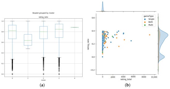 Moreover, it can be implied that the Steam platform indirectly played a role in gamifying the game releases and game ratings by providing a meta-game solution to well-known game studios and indie games. Figure 12 showed the boxplot and scatter plot of the positive rating ratio against the total rating of the collected Steam games. By considering the model, where G is the number of positive ratings and T is the total ratings a game received, Figure 12a showed that the majority of games regardless on which cluster they belong to were (except for some outliers). These findings substantiated that the Steam platform is still the biggest and most popular digital game distribution platform compared to other similar platforms for players and developers (such as Epic Games and itch.io). In addition, the outlier games () that were shown in Figure 12b implied that these outlier games are less popular or low rated (low v, which also implies low values).