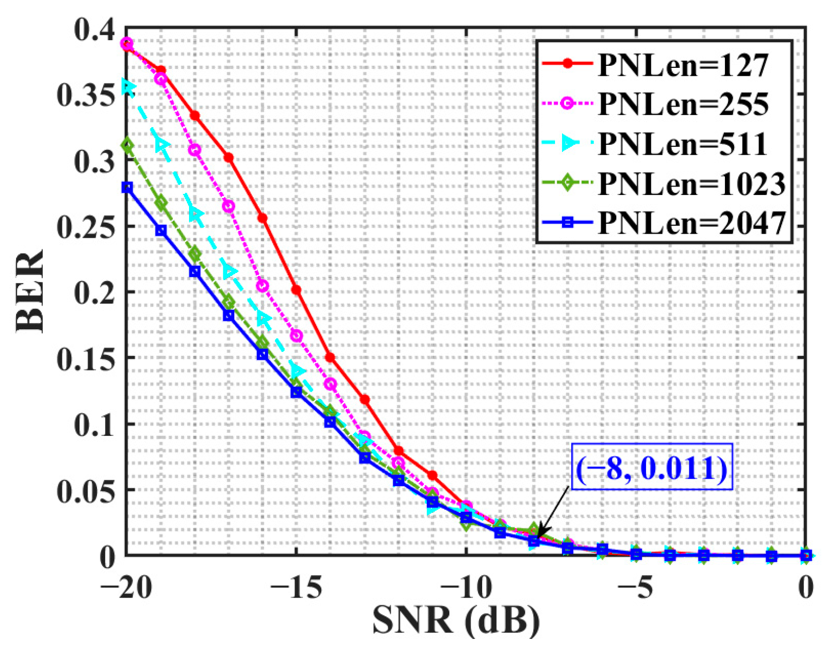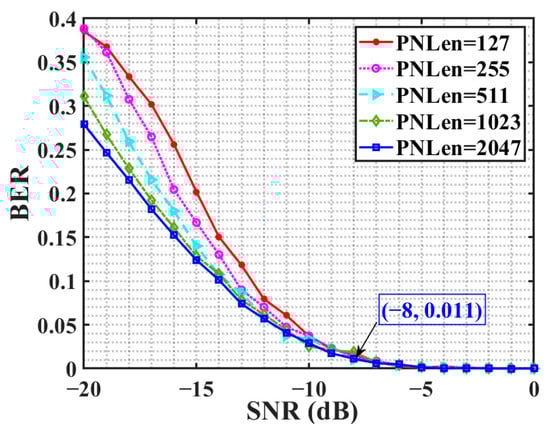 It can be seen that no matter how long the spread spectrum code sequence is, the BER of the estimated result decreases continuously with the increase in the SNR. When the SNR is higher than −8 dB, the spreading code sequence estimation method proposed in this paper is no longer affected by the length of the spreading code. When the SNR is lower than −8 dB, the longer the spreading code is, the lower the average BER is. It shows that in the case of low SNR, the longer the spreading code length is and the better the estimation performance.
