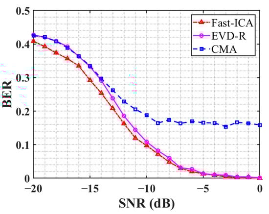 It can be seen from the Figure 7 that with the increase in the SNR, the average BER of the three algorithms all decreased. However, when the SNR is lower than −14 dB, the average BER of the Fast-ICA is almost 5% lower than the EVD-R and CMA. When the SNR is above −14 dB, the average BER of the EVD-R and Fast-ICA gradually tend to be the same. However, the average BER of CMA has reached a constant of about 15% value when the SNR reaches −9 dB. When the SNR is above −5 dB, the average BER of the Fast-ICA is less than 2%, which is same to the EVD-R. Overall, the spreading code estimation method of Fast-ICA is superior to the EVD-R and CMA.