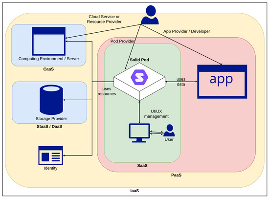 - Infrastructure as a Service (IaaS)—Users can control infrastructure (e.g., storage space, computing servers) directly, with potential limitations to use specific providers or offered choices, e.g., operating systems, networking components (e.g., web server and firewalls), data stores (e.g., databases or triple-stores), and virtualisation capabilities. Solid Pods can be readily deployed as self-controlled servers in an IaaS environment (https://solidproject.org/self-hosting/css access on 1 November 2022).
