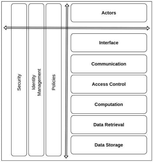 We identified the following layers (see Figure 2) by distinguishing between implementations of Solid Pods and applications in terms of interactions with data: data storage as the bottom layer given Solid’s reliance on data storage as a central concept, followed by data retrieval to retrieve stored data, computing to (optionally) perform computations on it, access control to control retrieval of information, communication to share information between entities and resources—and finally interface for interactions and management processes by actors. Orthogonal to these are layers associated with logging, policies, security, and identity which have relevance to and are influenced from implementations of each layer.