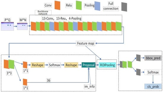 Faster RCNN consists of four main modules. The first module is conv layers, which can output a feature map. Faster RCNN object detection model proposes an RPN network model that is different from RCNN, SPPNet, and Fast RCNN [19]. The RPN is the second module, which can share convolutional layers with the detection models and generate proposals. The third module is ROI Pooling. It collects the input feature maps and proposals from RPN to extract the proposal feature maps, which are sent to the subsequent fully connected layer to classify. It implements end-to-end detection and improves the accuracy of the model. The structure of Faster RCNN is shown in Figure 1. The last module is used for classification and regression. The input is the proposal feature map obtained from the previous layer. The output is the class of the object and the exact location in the image. First, it proposes RPN, which achieves object detection performance with high accuracy. In addition, compared with other one-stage networks, two-stage networks are more accurate. Especially for high-precision, multi-scale and small object problems, the advantages of a two-stage network are more obvious. Faster RCNN works well on multiple datasets and object tasks and often achieves better results after fine-tuning. Finally, there are many points that can be optimized in the whole algorithm framework of Faster RCNN, which provides a broad space for algorithm optimization.
