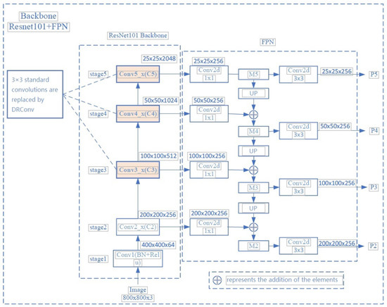 Faster RCNN has a large number of parameters. Furthermore, it is prone to overfitting. In the convolution process, small objects are easy to be lost and the recognition effect is bad. Thus, this paper fuses Feature Pyramid (FPN) and ResNet101 as the backbone network and replaces all 3 × 3 standard convolutions in the last three stages of ResNet101 with DRConv [20,21,22]. The improved ResNet101 is shown in Figure 2.