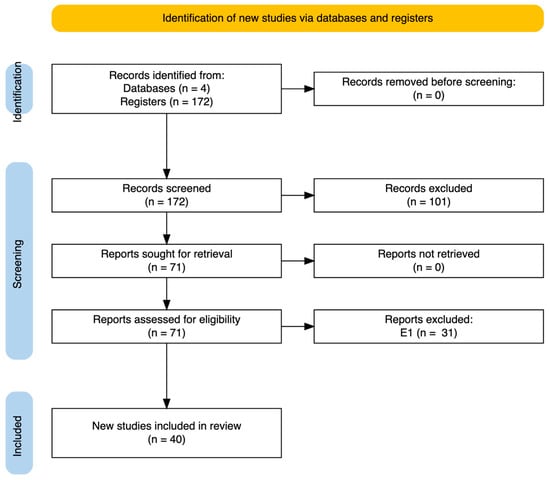 The flow diagram, a PRISMA figure (Figure 1), was created using the tool designed by Haddaway and McGuinness [50]. It can be seen that, for the selection of articles, the Web of Science, Scopus, and ERIC databases were used, taking the established concepts as a search reference, with a time delimitation between 2010 and 2022. In addition, a web search using the Mendeley search engine was added as a complementary search. The initial global exploration resulted in 172 articles, none of which were withdrawn before reading. The documents were analysed on the basis of the title and abstract according to the inclusion–exclusion criteria. After this analysis, 101 articles were excluded. The remaining 71 were located without difficulty and were analysed in full text in a second screening process. Thus, only 31 articles were omitted according to exclusion criterion E1, because they were articles that did not aim to include serious games in educational practice. This resulted in the final sample of documents for this systematic review (n = 40). The Zotero bibliographic manager was used for data collection. The synthesis of the information was carried out using a coding sheet in Calc. Three tools were used for the analysis of the results: VOSViewer, for the investigation of the conceptual network; Litmap, for the study of the network of interactions between authors; and RAWGraphs, for the representation of the documentary characteristics.