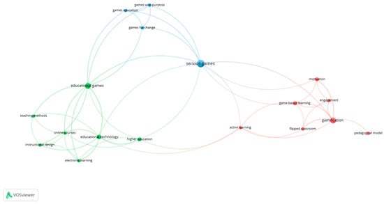 The blue cluster includes the term serious games, which is related to the green and red clusters through the concepts “educational games” and “gamification”. The key concept of this cluster is closely connected to “games for changes”, “games in education”, and “games with purpose”. A key concept identified in the green cluster is “educational games”, which is associated with “educational technology” and “learning methods”. The latter concept is closely related to “instructional design” and “online courses”. The concept “educational technology”, in turn, is linked to “higher education” and “electronic learning”, in addition to the other concepts indicated in the cluster. Finally, the red cluster has as the key term “gamification” related to the concept “engagement”, which in turn is connected with “motivation”. The key term is also joined to “pedagogic model”, as well as to “game-based learning” and “flipped classroom”, both of which are closely related to “active learning”.