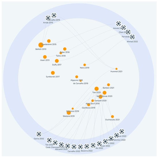 Figure 3, made with the Litmaps tool, shows the relationship between the articles that made up the review sample (among those with DOIs), shown in orange, and their interrelationship over time, not only with each other, but also with other relevant publications, shown in the grey area. Thus, de Carvalho is positioned as a reference author, having a constant presence in works related to serious games [27,51]. Similarly, Bellotti et al. [52] is also considered a reference author, but this time due to the number of citations in their article. The size of the orange circle is larger the more citations the article has. Likewise, Tsai et al. [53] stands out as the most cited work by the latest 2022 writings, which leads to consider that their article is relevant to the scientific community.