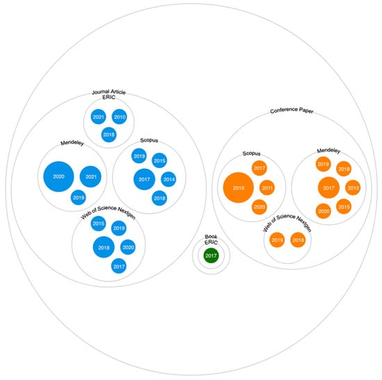 Of the four databases analysed, Mendeley, with 37.5%, and Scopus, with 32.5% of the publications, stood out with the greatest volume of documents contributed. These were followed by Web of Science, with 20%. ERIC also made a significant contribution of documents to this review, with 10%.