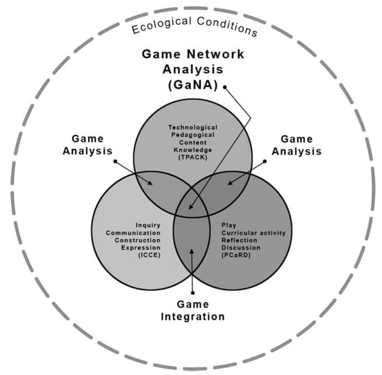 PCaRD is a pedagogical model aimed at incorporating digital play in the classroom to support student learning [68]. It is born out of a larger framework called Game Network Analysis (GaNA) (Figure 6), which aims to assist teachers and researchers in their introduction of game-based learning into the classroom, guiding them from game analysis to the integration of play into the curriculum. The PCaRD model leverages teachers’ technological pedagogical content knowledge (the TPACK model by Mishra and Koehler [59]) about games to create learning and assessment activities (Figure 7). This model attempts to engage students in an informal training process through play, followed by teacher-designed activities that connect to the subject matter of the game. The tasks should include reflection, writing, expression, and discussion activities, seeking the development of knowledge that connects the game process with the curricular activities. The process that is established should include the game, the curricular activity, reflection, and discussion.
