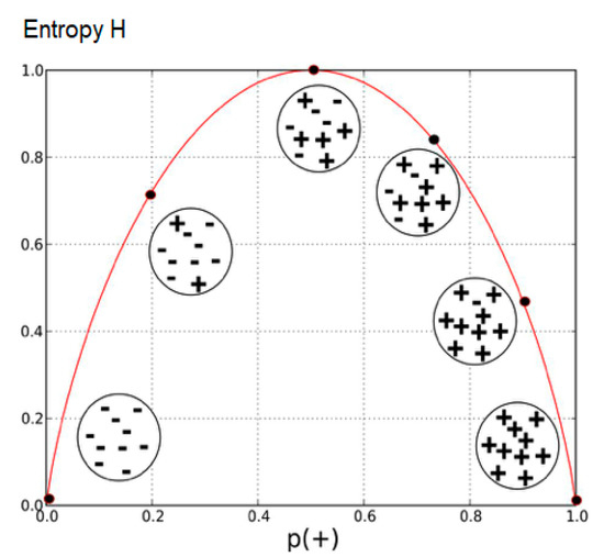 Simplest example of the distribution of entropy values H for a two-component system (components [+] and [−]). In the case of equal weights of two components of the system (when w(+) = w(−)) the entropy of the system H = 1.0.