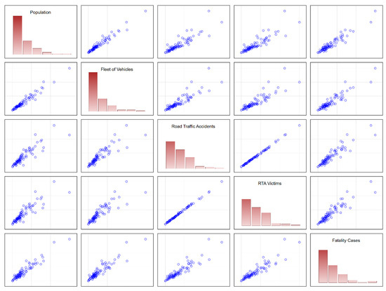 The simplicity and identity of the cause–effect chain (Figure 2) to the studied information process of the road traffic accident rate formation is confirmed by the presence of a pronounced correlation between the blocks. Correlation analysis carried out in relation to 82 subjects of the Russian Federation made it possible to obtain the following correlation matrix of the relationship between regional values (2021) of the characteristics corresponding to the five blocks of the cause–effect chain (Figure 3, Table 1).