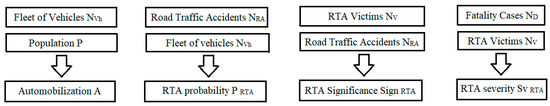 The road traffic accident rate, as one of the most negative results of the functioning of large transport systems, is characterised by the following simplest cause–effect chain (Figure 2).