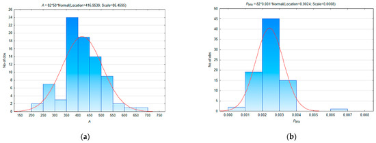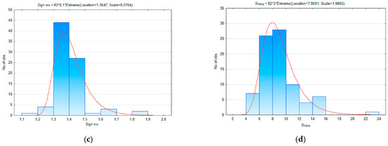 Statistical distributions of regional values of characteristics that determine the specifics of the information process of the functioning of the regional transport system. (a) Automobilization A; (b) RTA Probability P RTA; (c) RTA Significance Sign RTA; (d) RTA Severity Sv RTA.