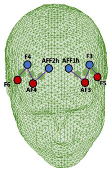 For the montage, four emitters were installed at AF3, AF4, F5, and F6, and four detectors were installed at AFF1h, AFF2h, F3, and F4. The emitter-detector distance for consecutive optodes was kept at 30 mm, and two wavelengths of near-infrared light were used (760 and 850 nm). Six channels were acquired using this optode configuration: Ch1 (AF3-F3), Ch2 (AF3-AFF1h), and Ch3 (F5-F3), which corresponded to the left PFC, and Ch4 (AF4-F4), Ch5 (AF4-AFF2h), and Ch6 (F6-F4), which corresponded to the right PFC [6,48] (Figure 2). The sources, detectors, and space between them were placed in relation to the underlying functional region and the most appropriate Brodmann area according to online atlases [49,50].