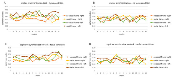 fNIRS coherence values for O2Hb. Trend of the coherence indices for the motor synchronization task in the focus (A) and no focus conditions (B) and for the cognitive synchronization task in the focus (C) and no focus conditions (D) in each dyad.