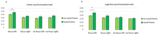 Then, a third interaction effect was found for condition × task × lateralization × frame (F [1, 82] = 7.89, p = 0.01, η2 = 0.432). A pairwise comparison revealed an increase in coherence in the left hemisphere when the participants in the focus condition performed the motor synchronization task with a social frame compared with no social frame (F [1, 15] = 8.98, p = 0.01, η2 = 0.408) (Figure 4A). According to the pairwise comparison, greater coherence was observed in the left hemisphere when the participants in the focus condition performed the cognitive synchronization task with a social frame compared with no social frame (F [1, 15] = 8.04, p = 0.01, η2 = 0.391) (Figure 4B).